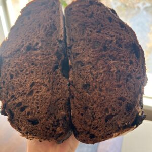 A rich cocoa-forward sourdough loaf loaded with chocolate chips. Soft, fragrant and not too sweet. Makes any day a special occasion.