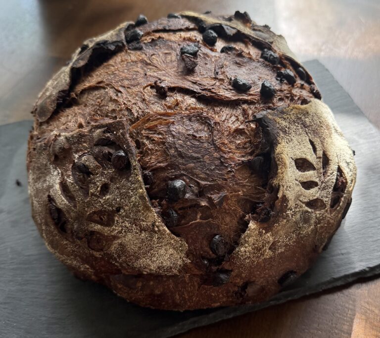 A rich cocoa-forward sourdough loaf loaded with chocolate chips. Soft, fragrant and not too sweet. Makes any day a special occasion.